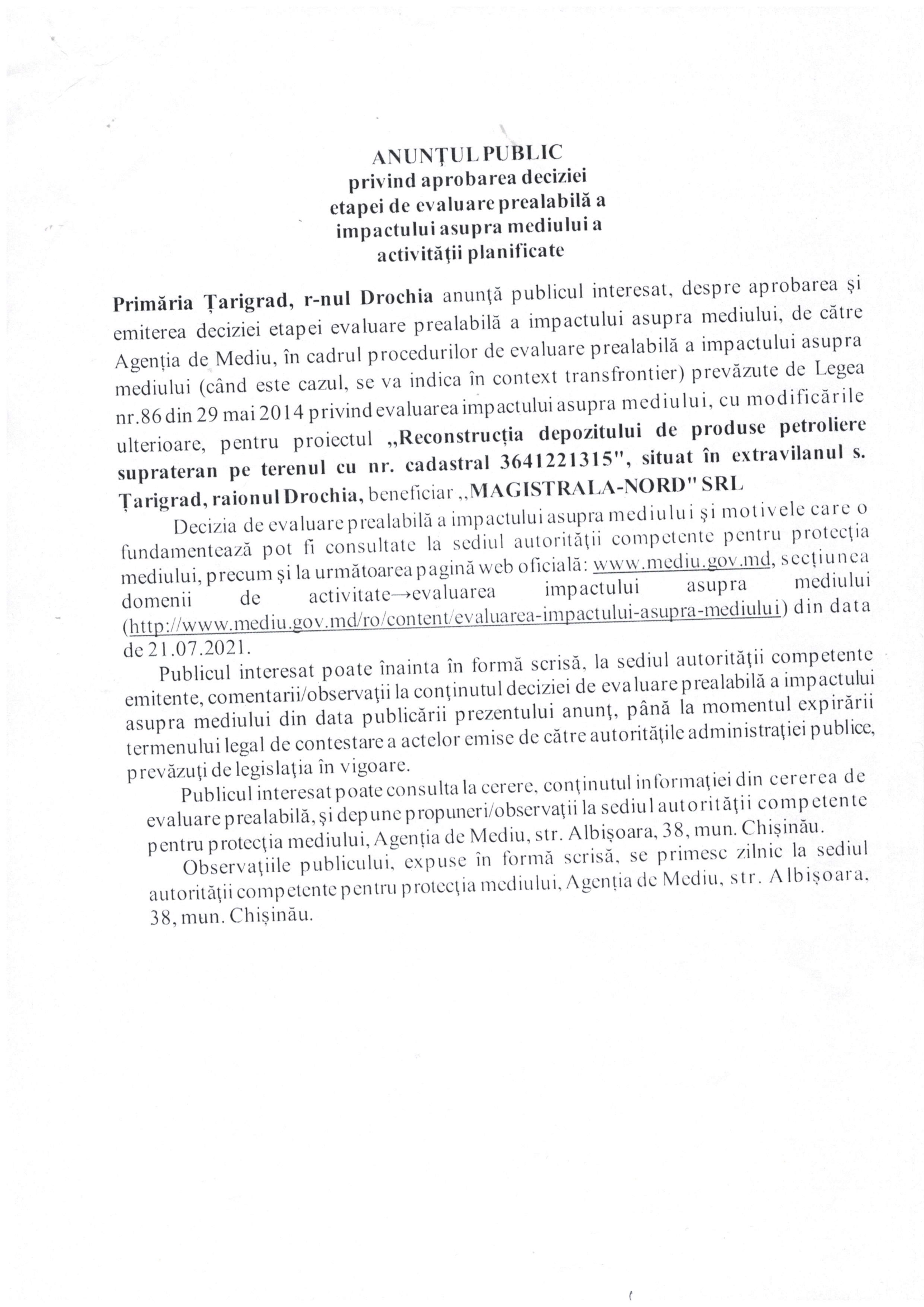 Anunț cu privire la impactul asupra mediului prin activitatea planificată