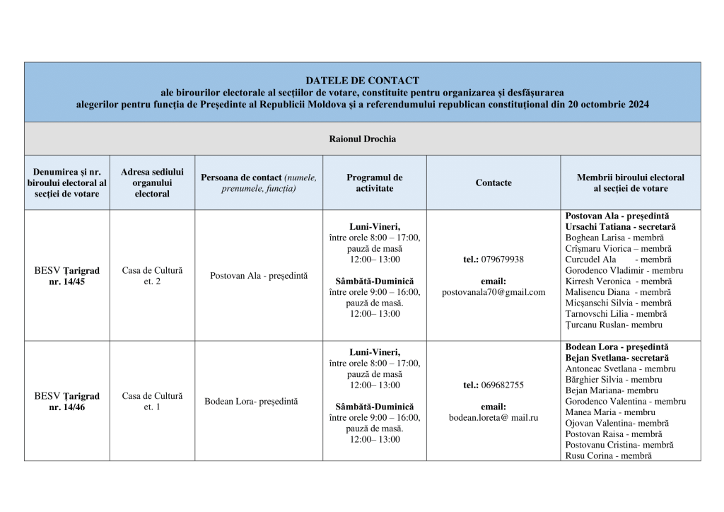 DATELE DE CONTACT ale birourilor electorale al secțiilor de votare
